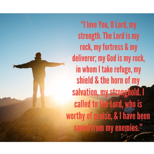 “I love you, Lord, my strength. The Lord is my rock, my fortress & my deliverer; my God is my rock, in whom I take refuge, my shield & the horn of my salvation, my stronghold. I called to the Lord, who is worthy of praise, & I have been saved from my enemies.” ~ Ps 18:1-3